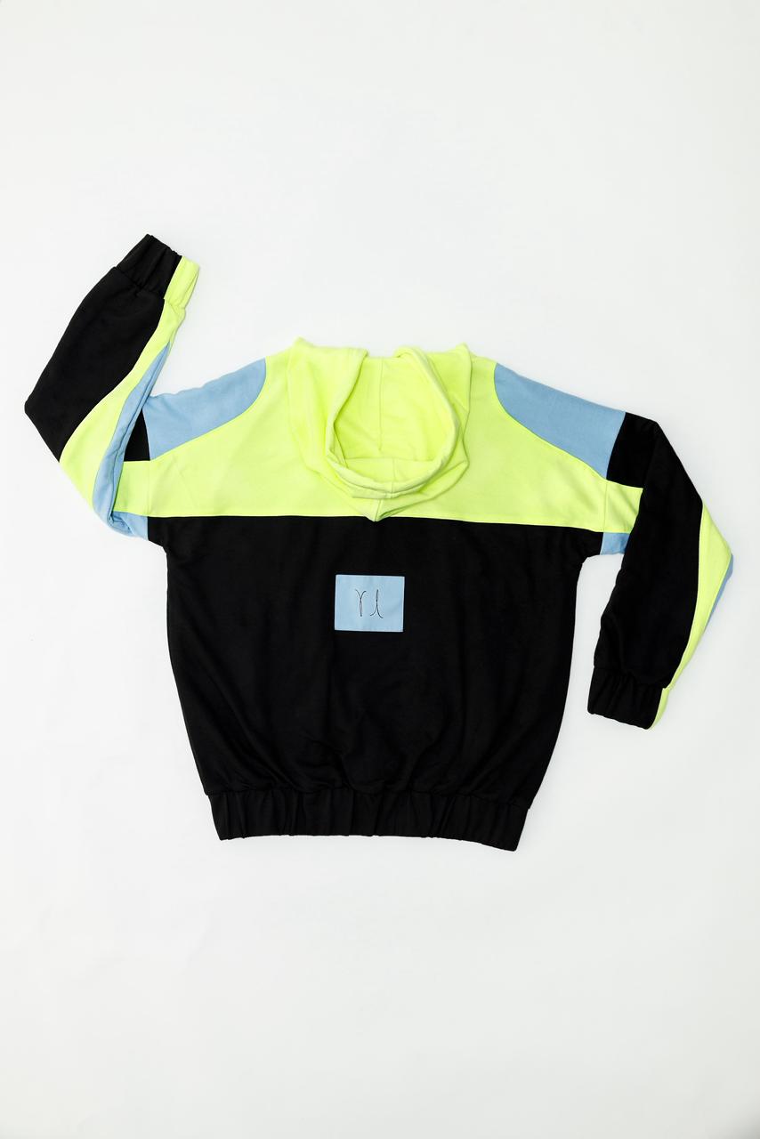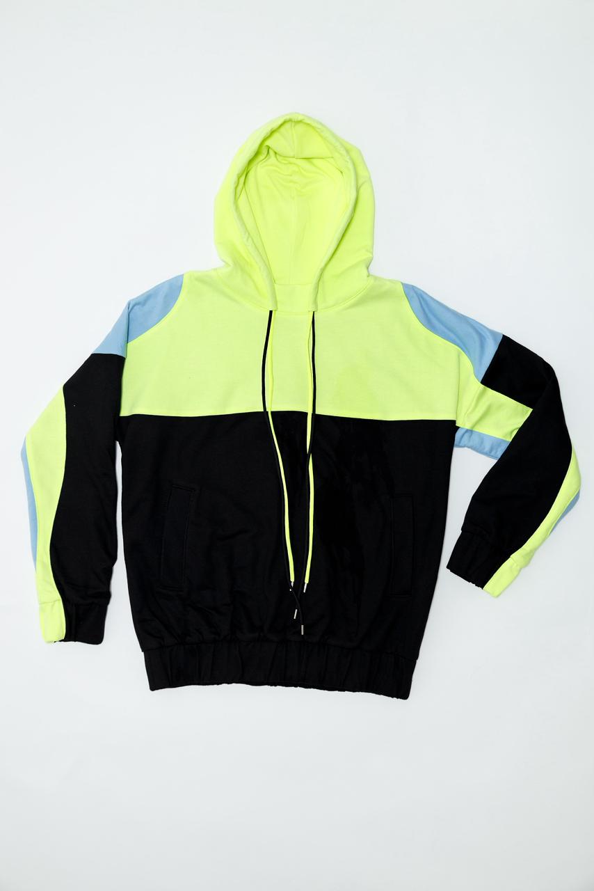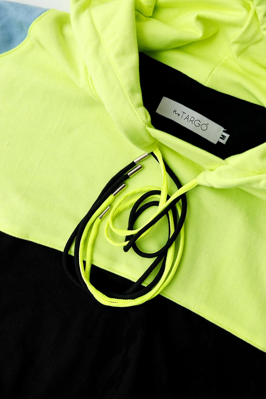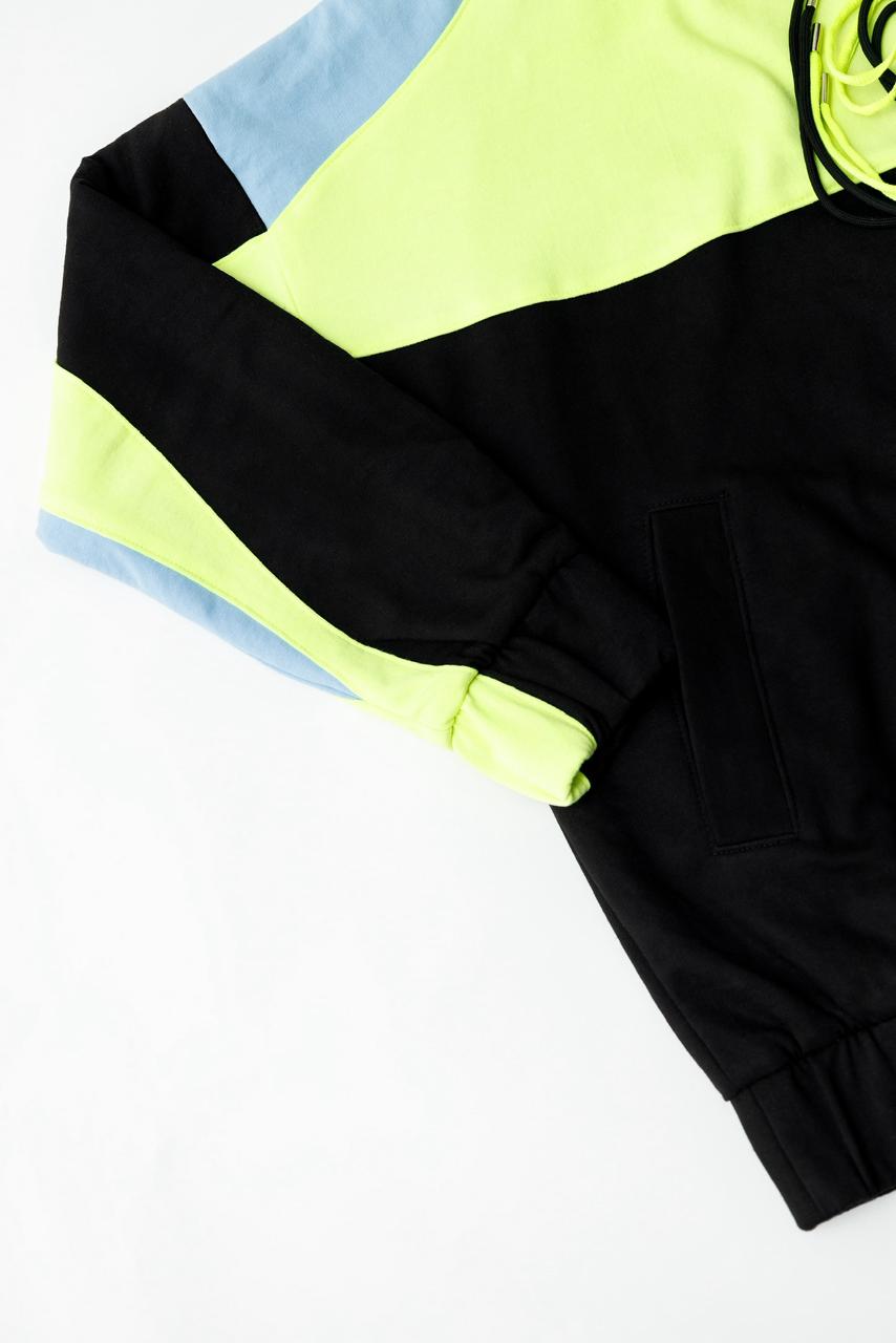 Sudadera negra con amarillo y azul 50% algodón 50% poliéster con agujetas de colores. Cómoda, suave y moderna. UNISEX con ADN masculino.