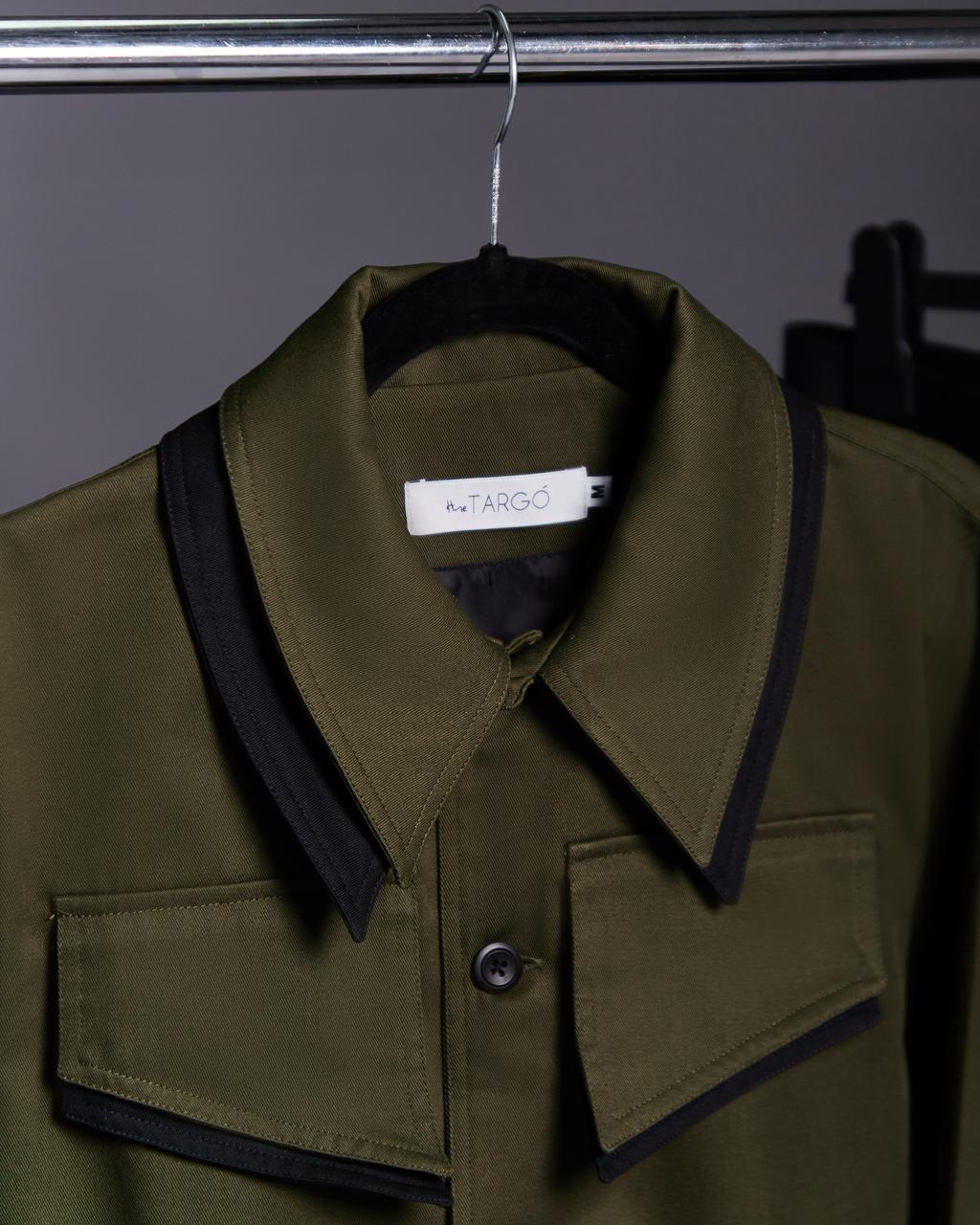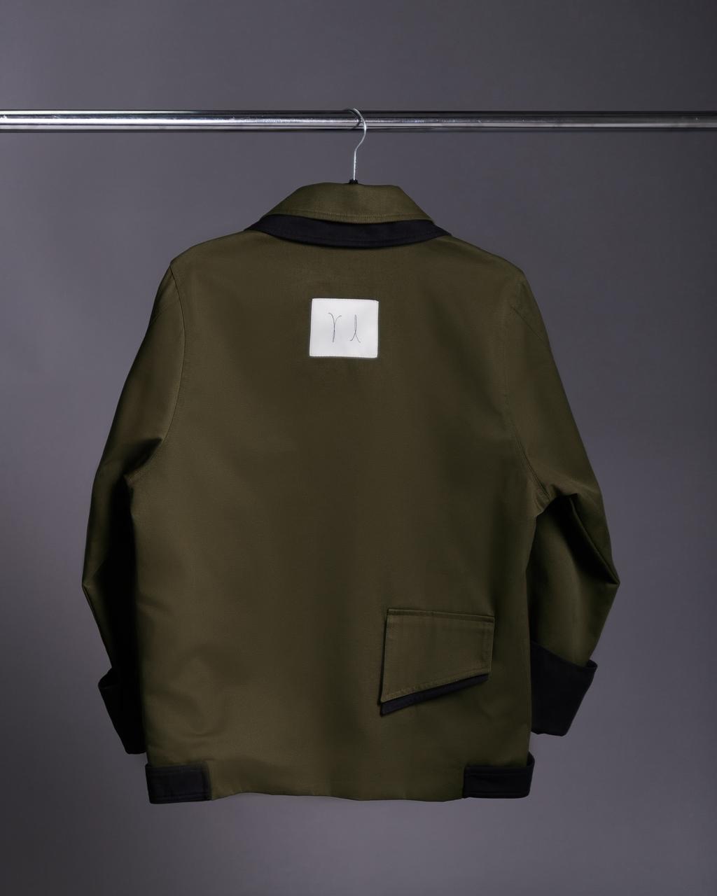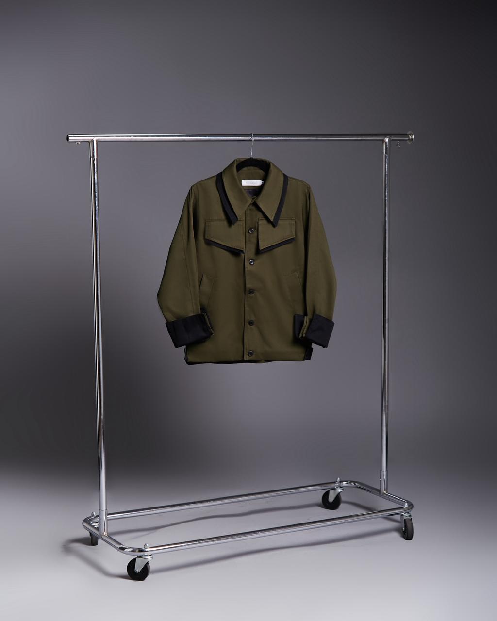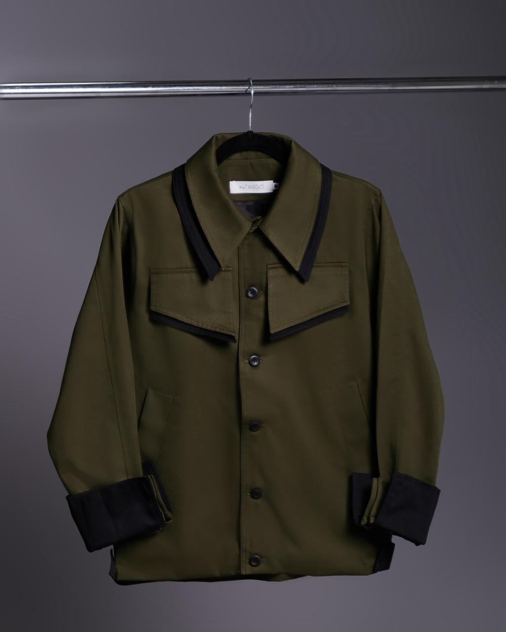 Chamarra en gabardina 100% algodón color verde botella con detalles en color negro.