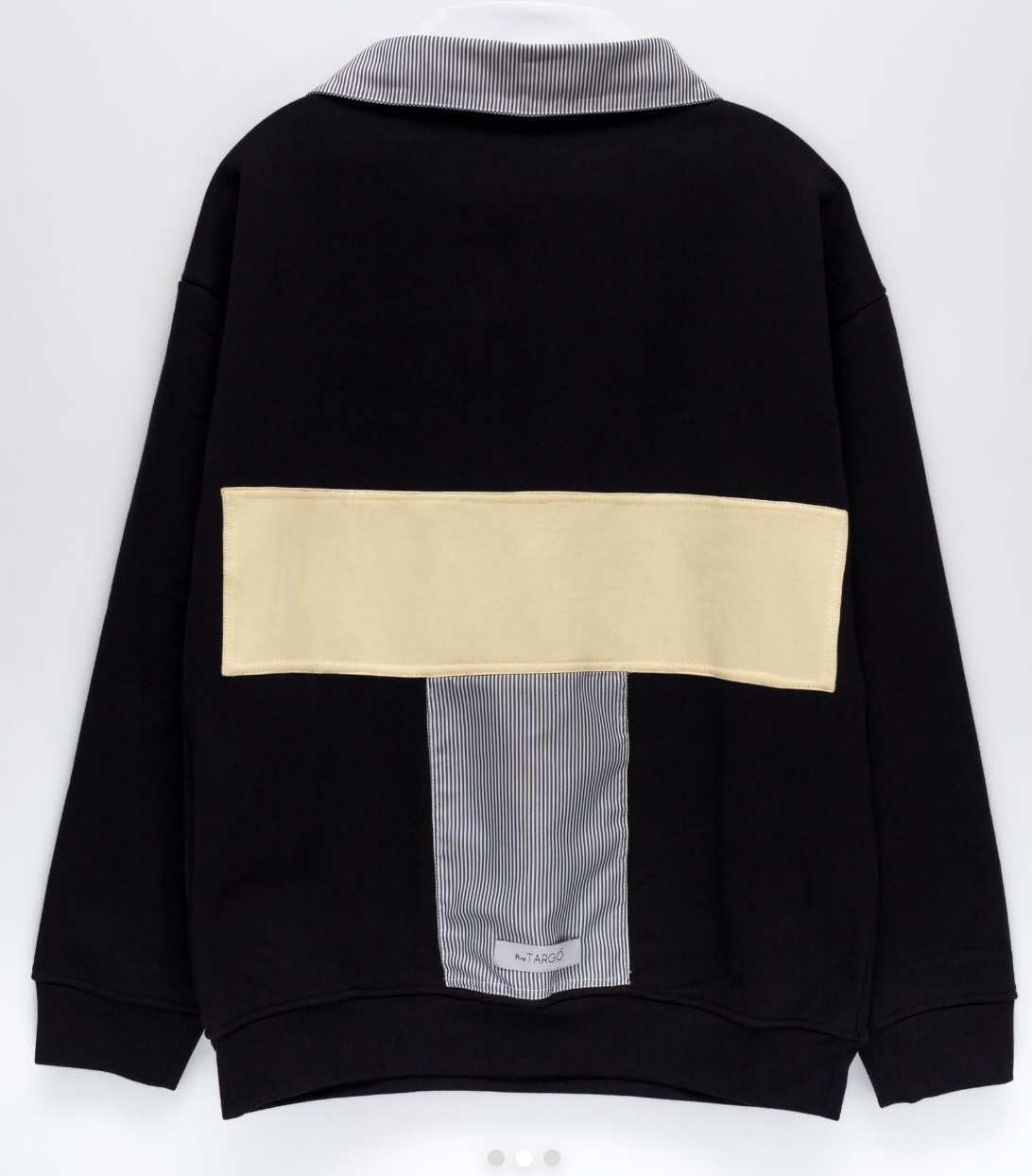 Sudadera negra 50% algodón 50% poliéster cuelo redondo con detalle de doble cuello tipo camisa. Detalles en tela bordados en parte trasera